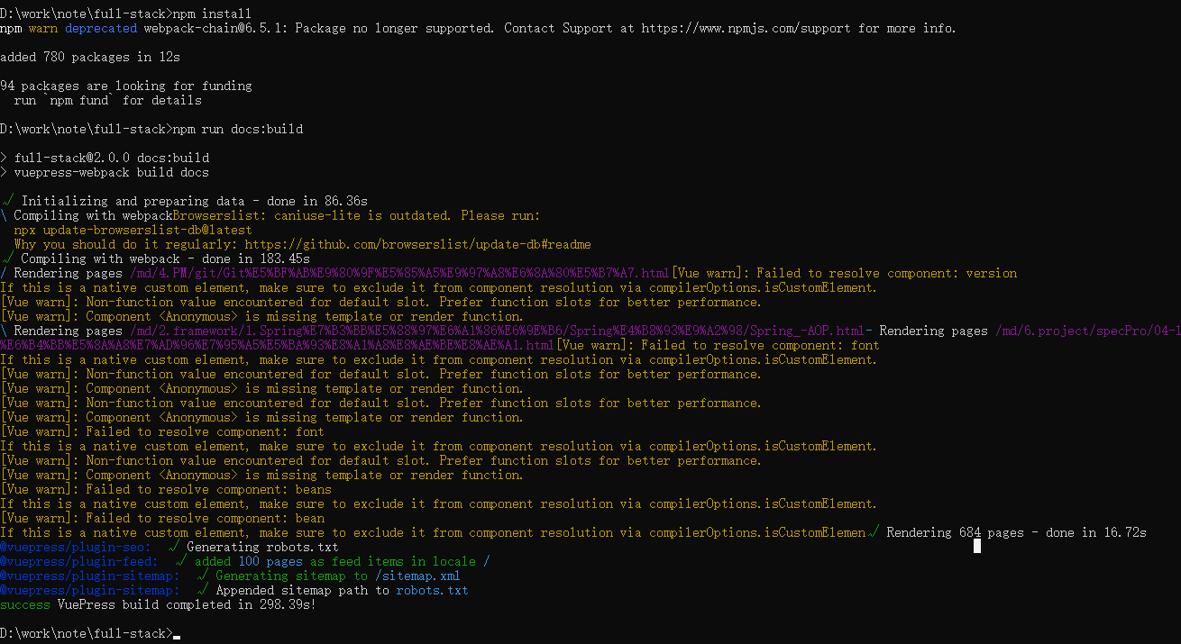 npm install导入依赖,随后执行npm run docs:dev启动项目(如果项目过大则需要调整配置(例如在cmd窗口中调整配置,关闭cmd窗口后重启再次尝试部署、打包))