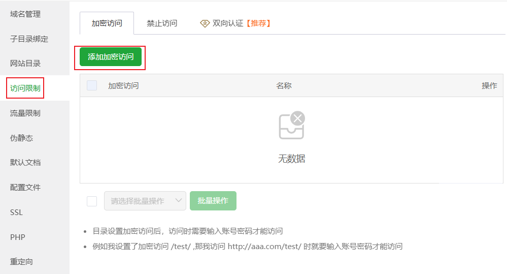 也可以在网站部署处限定访问目录=》【添加加密访问】,限定访问指定目录的权限