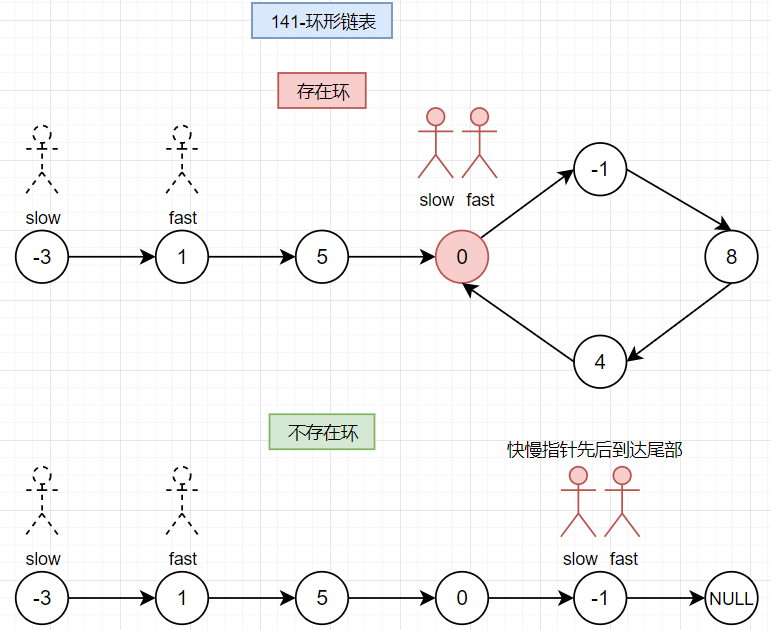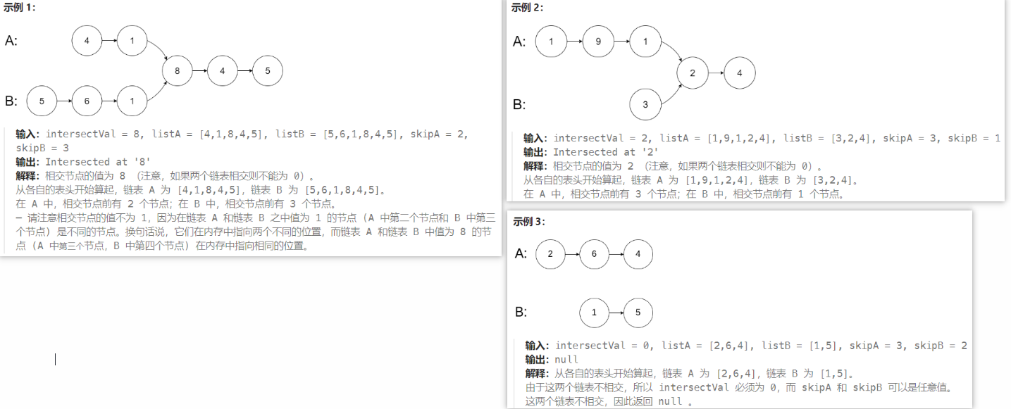 规律分析:无论A、B是否有相交节点,最终都会指向同一个相同的节点(要么是公共尾部、要么是NULL)