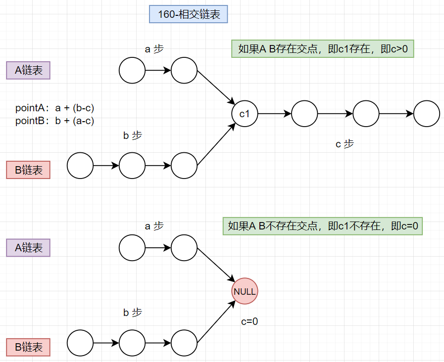 c=0(说明两链表没有公共尾部),即pointA和pointB都指向NULL