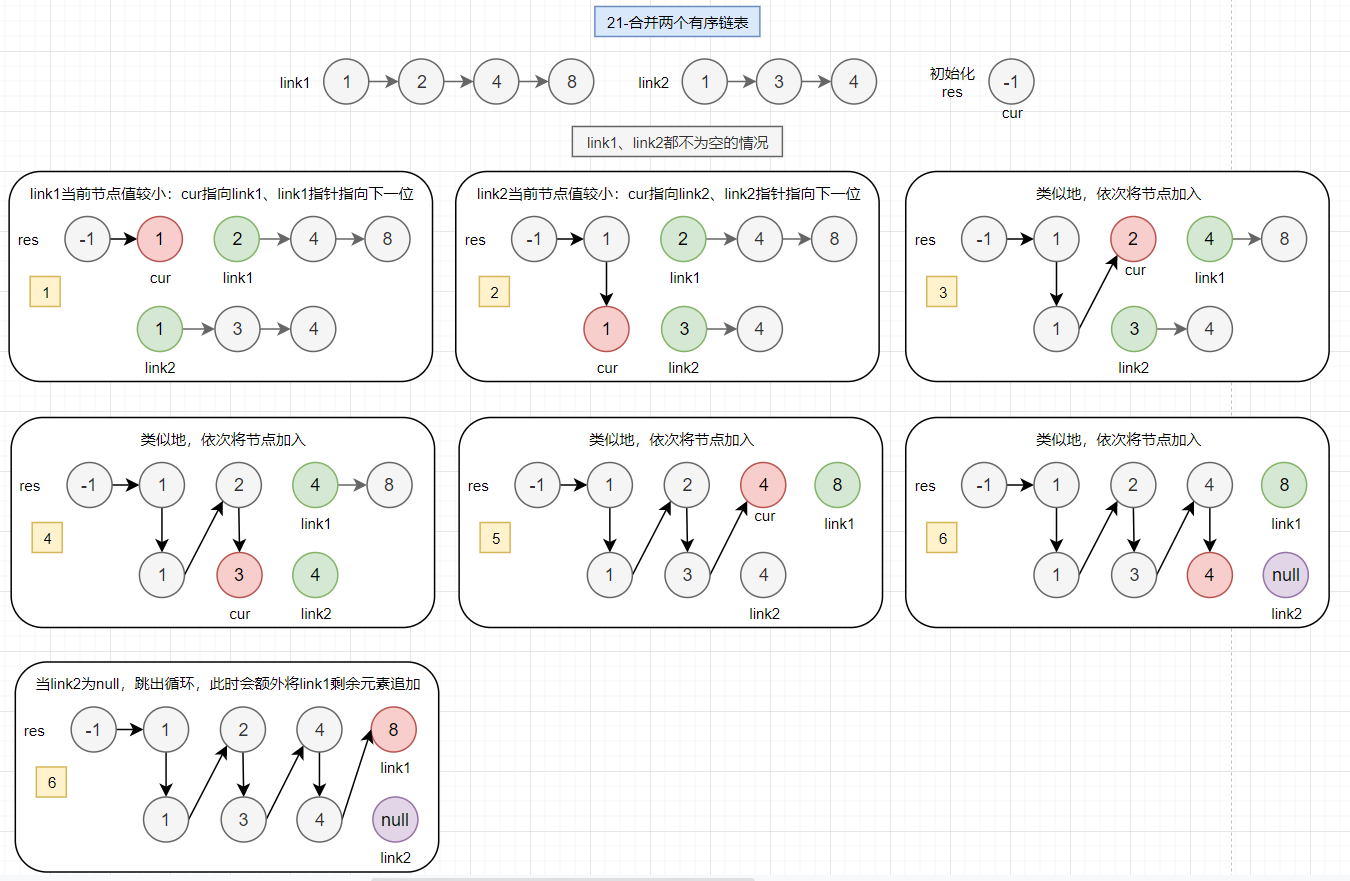 // 遍历链表(当两个链表其中一个链表遍历到尾部,则可结束循环,然后将剩余的元素直接补到尾部即可)