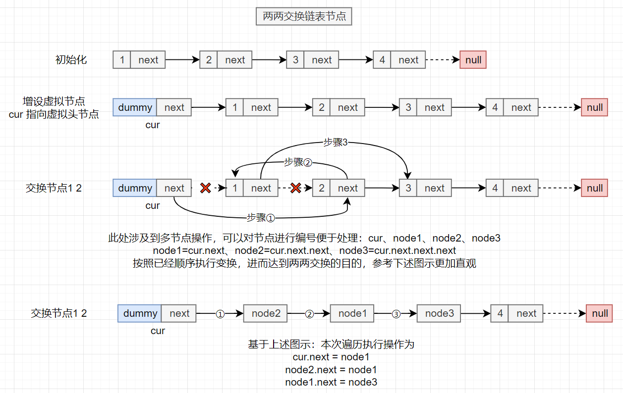- 初始化:让pointA和pointB分别指向链表A、B的头节点,之后两个指针分别以步幅为1的速度向链表的尾部遍历