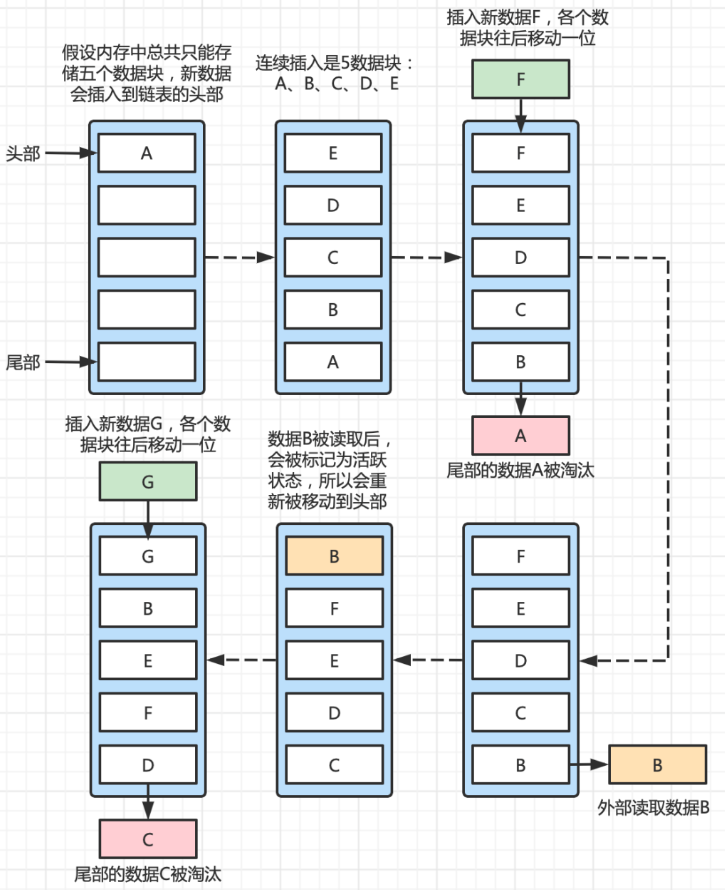 基于上述流程分析,优化LRU的设计思路,如何通过不记录访问频次的方式实现LRU?即类似排队的概念,选定一个方向进行淘汰,当数据被访问时就将其重新排到后面去,以此达到不记录访问频次就能实现LRU淘汰的效果 =》淘汰尾部的数据(尾部存储的是最久远访问的数据)、让活跃的节点移动到队列另一段