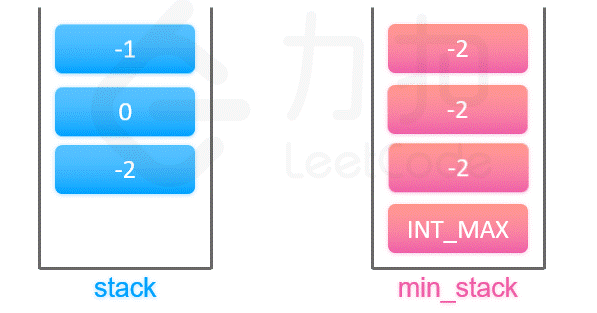 如果一开始按照单个栈的思路实现,可能会有点懵,因为要确保获取堆栈最小元素的时间复杂度为常数级别,最开始想到的可能是在栈顶去维护这个当前的最小值(例如入栈和出栈操作时同步维护min在栈顶的更新)