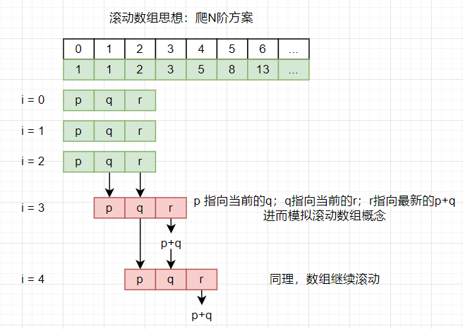 - 结合规律分析:当要爬第n阶的时候,它的方法相当于是基于第n-1阶的方案再爬1阶 + 基于第n-2的方案再爬2阶,即等价于爬N阶的方案个数实际等于爬N-1+爬N-2的方案个数,基于此可以看到这种思路很像斐波那契数列的调调,可以基于动态规划思路实现(将问题拆分为多个子问题)