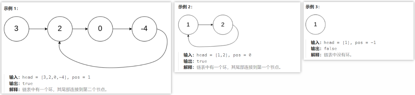 如果链表中有某个节点,可以通过连续跟踪 next 指针再次到达,则链表中存在环。 为了表示给定链表中的环,评测系统内部使用整数 pos 来表示链表尾连接到链表中的位置(索引从 0 开始)。注意:pos 不作为参数进行传递 。仅仅是为了标识链表的实际情况。