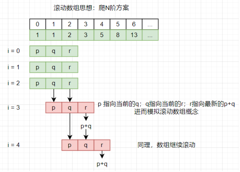 - 思路分析:基于【方法1】中动态规划思路,题中要求第N的方案,观察动态规划公式,n 阶方案只与其前两阶有关,因此可以考虑通过构建滚动数组的方式,每次滚动记录前两阶的方案数,进而达到空间优化的效果