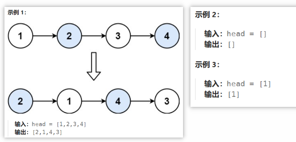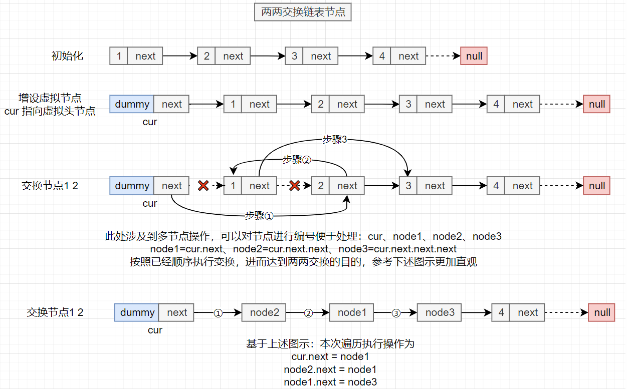 dummy虚拟头节点构建新链表,然后两两交换(画图分析,明确两两交换涉及到的节点操作和节点顺序)