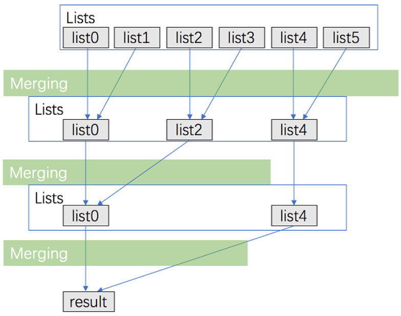 - ③ 合:将排序后的子列表进行合并(此处可以使用【合并两个有序链表】的思路去做:直接遍历合并或者借助堆来进行合并)