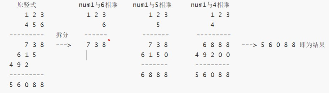 nums1 * nums2为例,其本质上就是将nums2中的每一位与nums1进行相乘,然后将相乘的结果进行累加(这个过程中需要注意0的数位填充问题)num2除了第一位的其他位与num1运算的结果需要 补 0- 计算字符串数字累加其实就是字符串相加的处理过程