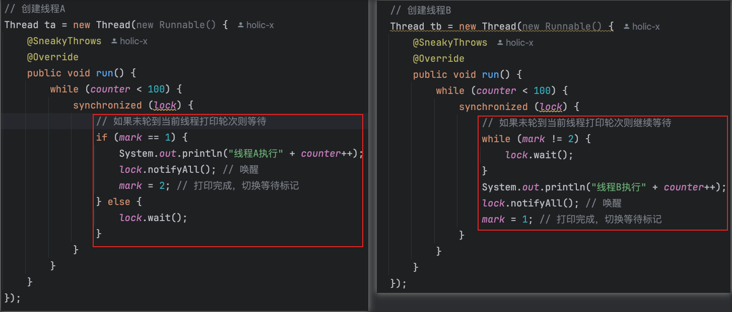 思路分析:构建2个线程,其主要的工作是监听当前counter是否达到100,如果没有则需要打印数据(而打印的这块代码则是需要进行加锁synchronized),加锁的部分主要进一步校验是否到自己的打印轮次,如果没有轮到(根据全局等待标记)则继续等待,如果轮到则执行打印操作、唤醒其他所有线程并切换标记,将代码的执行权交出去