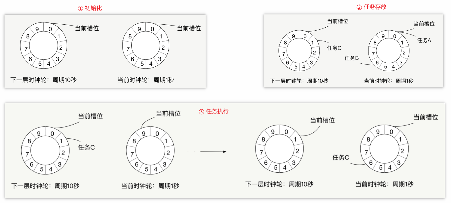 - ② 解决方案:引入时钟轮概念,解决上述定时任务处理创建大量线程、定时任务重复扫描的痛点