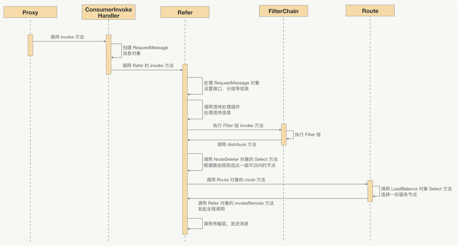 调用端向服务端发起调用时,会先经过动态代理,之后会调用Refer对象的invoke方法,Refer对象会先对要透传的消息进行处理,再执行Filter链,调用端最后一个Filter会根据配置的路由规则选择出符合条件的一组服务端节点,之后调用Route对象的route方法,route方法的内部逻辑会根据配置的负载均衡策略选择一个服务端节点,最后向这个服务端节点发送请求消息。