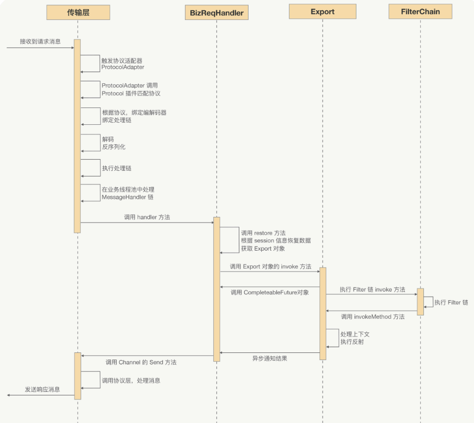 服务端的传输层收到调用端发送过来的请求消息,在对请求消息进行一系列处理之后(如解码、反序列化、协议转换等等),会在业务线程池中处理消息,关键的逻辑就是调用Exporter对象的invoke方法,Exporter对象的invoke方法会执行服务端配置的Filter链,最终通过反射或预编译对象执行业务逻辑,再将最终结果封装成响应消息,通过传输层响应给调用端。