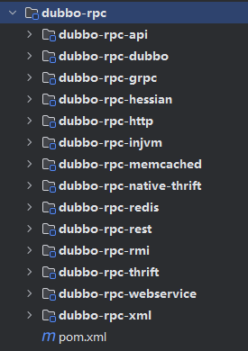 Dubbo 中对远程调用协议进行抽象的模块,其中抽象了各种协议,依赖于 dubbo-remoting 模块的远程调用功能。dubbo-rpc-api 子模块是核心抽象,其他子模块是针对具体协议的实现,例如,dubbo-rpc-dubbo 子模块是对 Dubbo 协议的实现,依赖了 dubbo-remoting-netty4 等 dubbo-remoting 子模块。 dubbo-rpc 模块的实现中只包含一对一的调用,不关心集群的相关内容