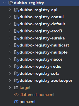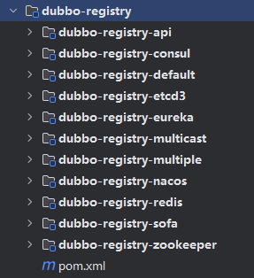 Dubbo 中负责与多种开源注册中心进行交互的模块,提供注册中心的能力。其中, dubbo-registry-api 子模块是顶层抽象,其他子模块是针对具体开源注册中心组件的具体实现,例如,dubbo-registry-zookeeper 子模块是 Dubbo 接入 ZooKeeper 的具体实现