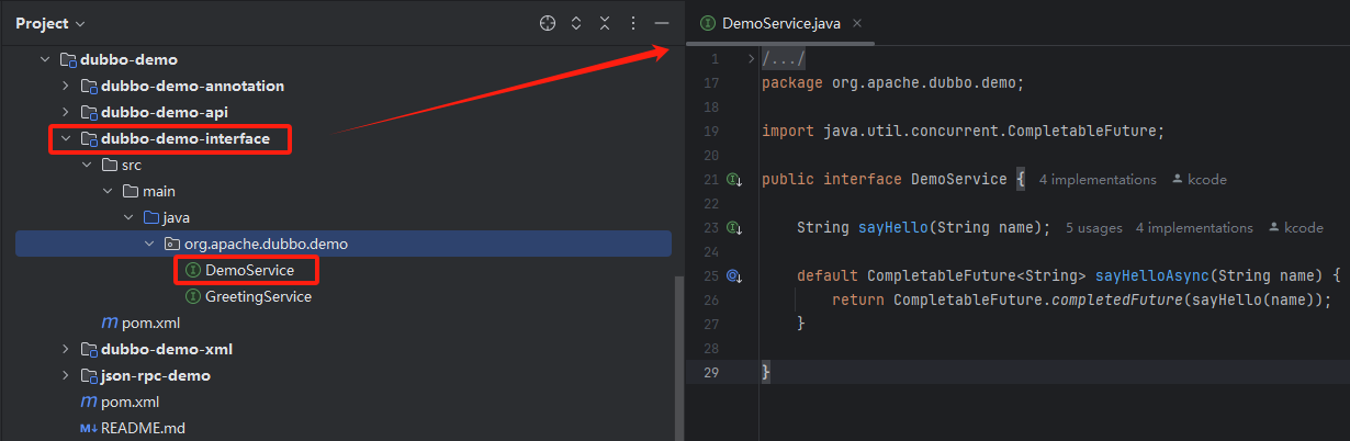 dubbo-demo-interface 模块就是定义业务接口的地方,如下图所示: