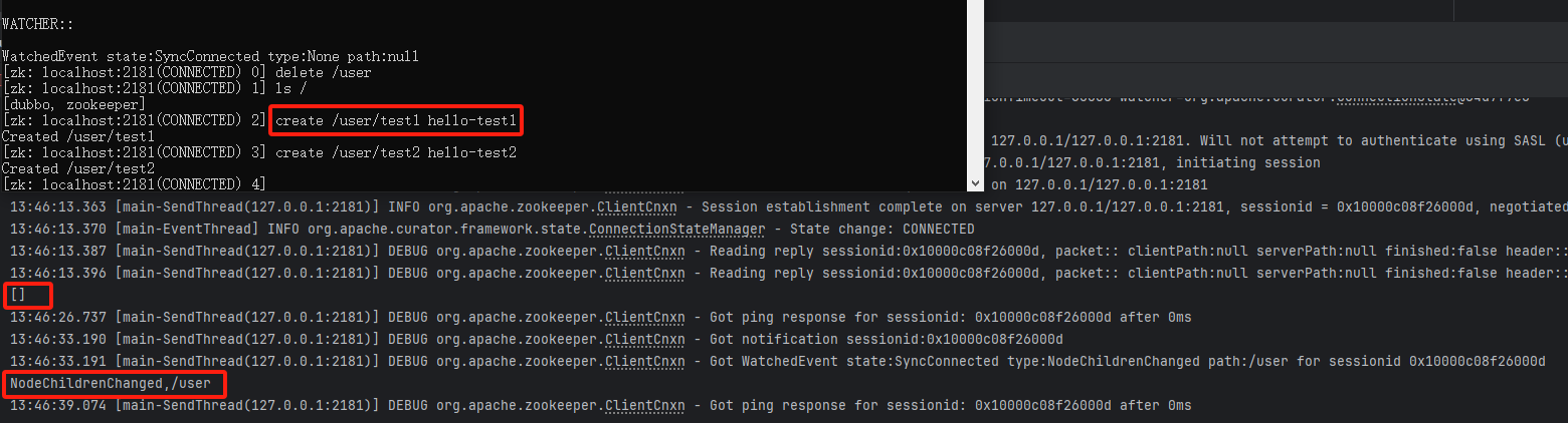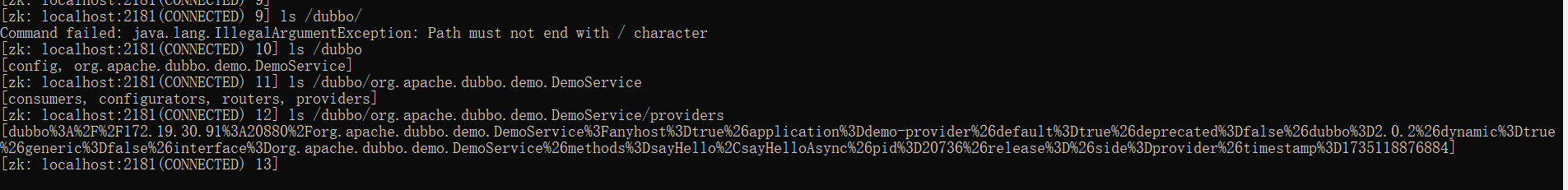 如果在demo启动的时候提示zookeeper not connected则尝试关闭窗口重启zookeeper后尝试(有可能是zookeeper没有启动成功,也有可能是连接zookeeper超时导致异常触发)。正常来说,如果demo(例如provider启动连接zookeeper)启动尝试连接zookeeper时,相应cmd窗口会有信息提示,如果没有(可能程序一直卡在那里),则需要关闭窗口尝试重新启动zookeeper