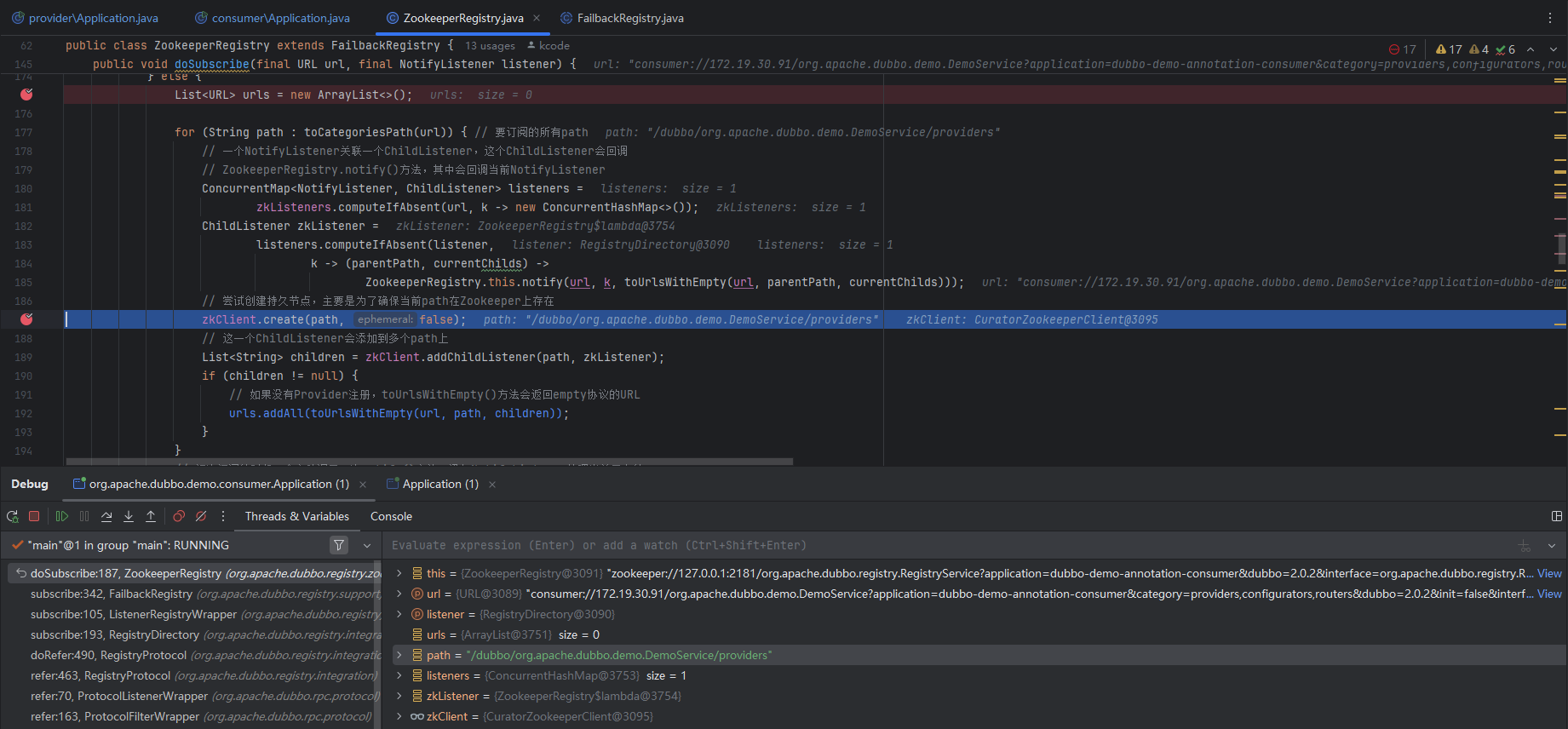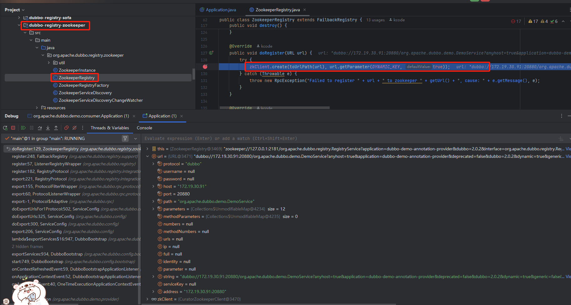 // 创建ZookeeperRegistry,并将Provider的地址信息封装成ServerInfo对象注册到Zookeeper
