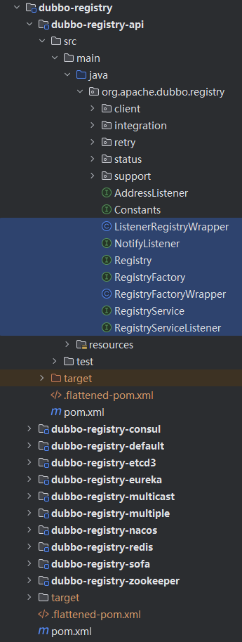 其中,RegistryFactoryWrapper 是 RegistryFactory 接口的 Wrapper 类,它在底层 RegistryFactory 创建的 Registry 对象外层封装了一个 ListenerRegistryWrapper ,ListenerRegistryWrapper 中维护了一个 RegistryServiceListener 集合,会将 register()、subscribe() 等事件通知到 RegistryServiceListener 监听器。