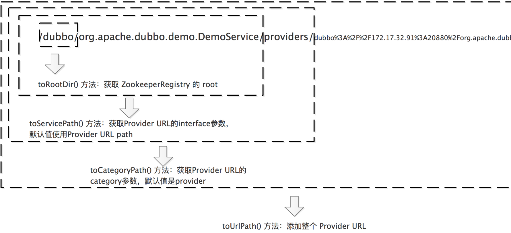 此处注意一下 toUrlPath() 这个方法得到的路径,是由下图中展示的方法拼装而成的,其中每个方法对应 Zookeeper 节点层级图中的一层