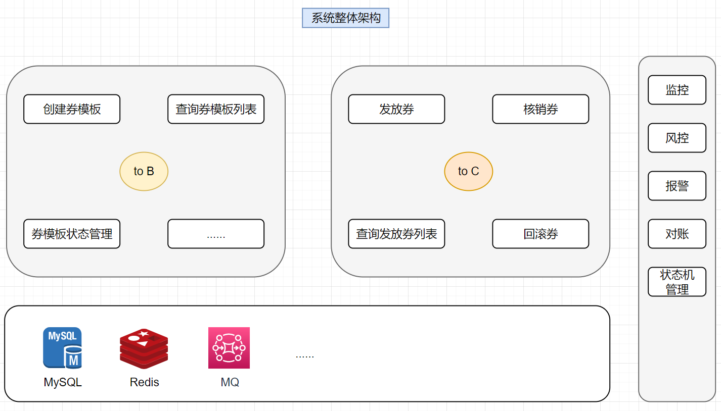 toB(券模板管理):创建券模板、查询券模板列表、券模板状态管理 .... 等核心功能toC(券记录管理):发放券、核销券、券状态管理、查询券列表.... 等核心功能