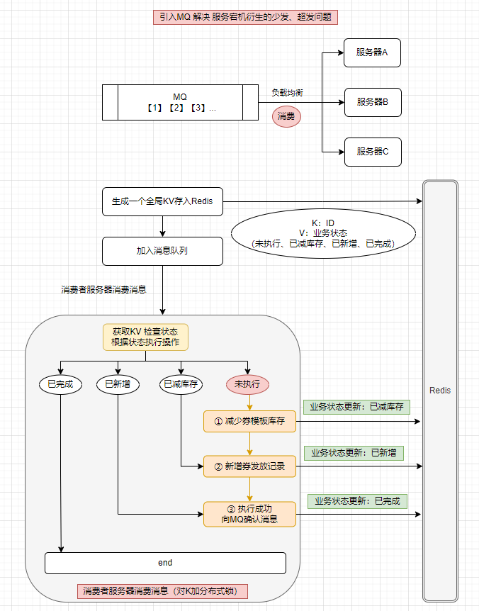 同理,基于上述步骤分析,如果执行到第③部的时候服务器突然宕机,这个时候用户领取了优惠券,也可以跟踪到自己的领券记录,但库存却没有减少,因此导致了"超发"问题,也就是上面提到的由于库存超发给平台或者商铺带来损失
