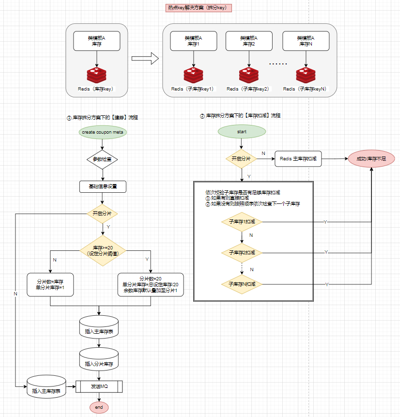 从问题本身出发,为了解决热点库存问题(即热点key问题),最常见的方案就是打散(将数据均匀分布在不同分片上),业界也有通用的方案:即扣减的库存key不要集中在一个分片上,因此思考如何保证这一个券模板的key不集中在某一个分片上呢?=》同理,拆用分拆思路,拆 key 即可(拆库存)