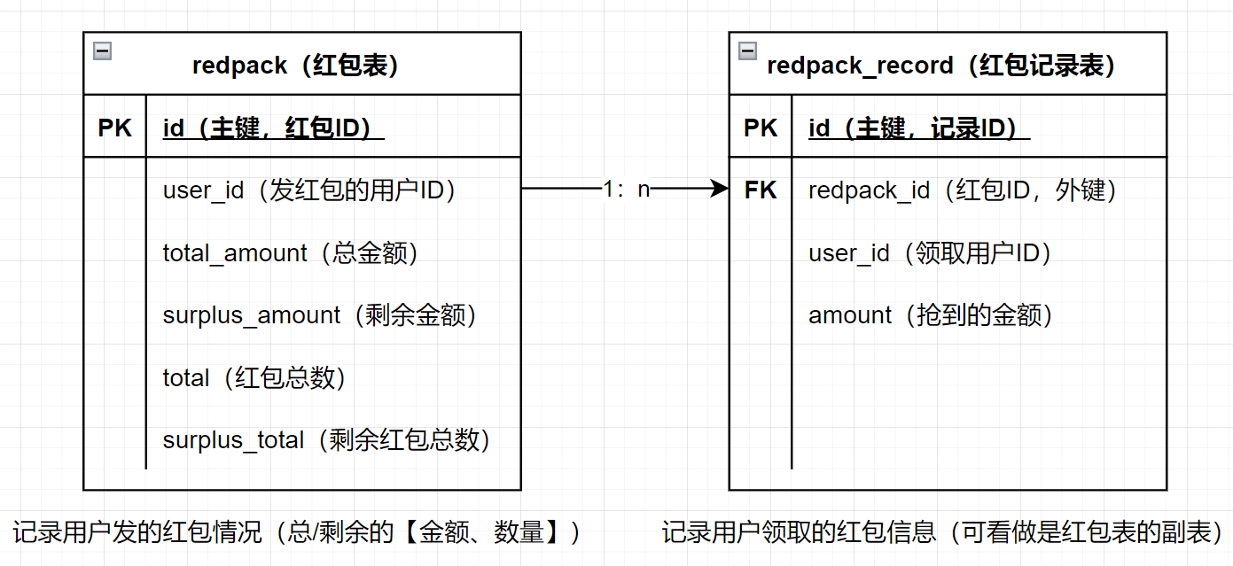 - ② 存储设计(存储选型):MySQL存储(数据表:红包表、记录表)
