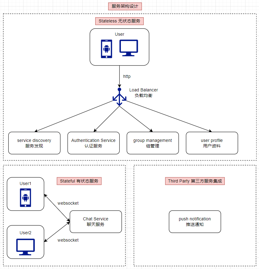 - (2)聊天系统服务分类:无状态服务、有状态服务、第三方服务集成