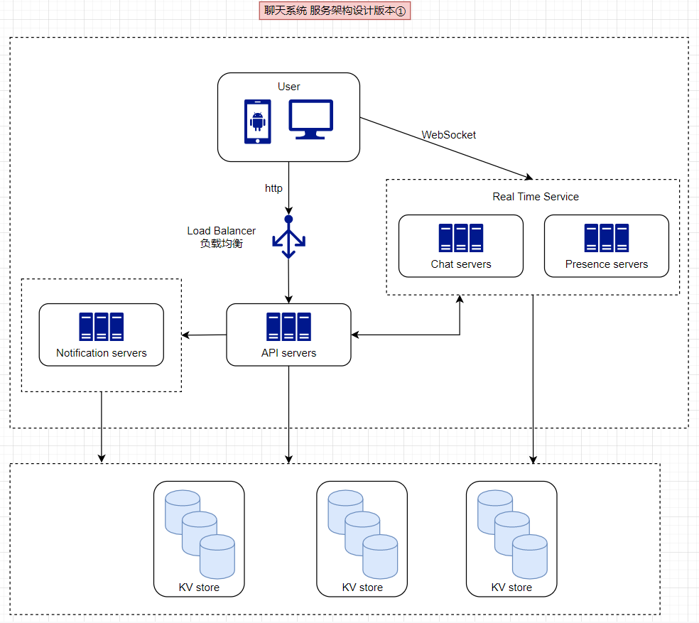 此处介绍一个聊天系统架构,它支持1对1的聊天和小群组聊天。WebSocket用于客户端和服务器之间的实时通信。聊天系统包含以下组件:用于实时消息传递的聊天服务器、用于管理在线状态的状态服务器、用于发送推送通知的推送通知服务器、用于聊天历史持久性的键值存储以及用于其他功能的API服务器。