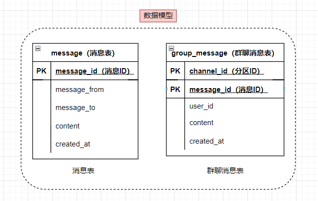 - 数据模型:消息表(message_id 主键消息ID)、组消息表(channel_id、message_id 复合主键)
