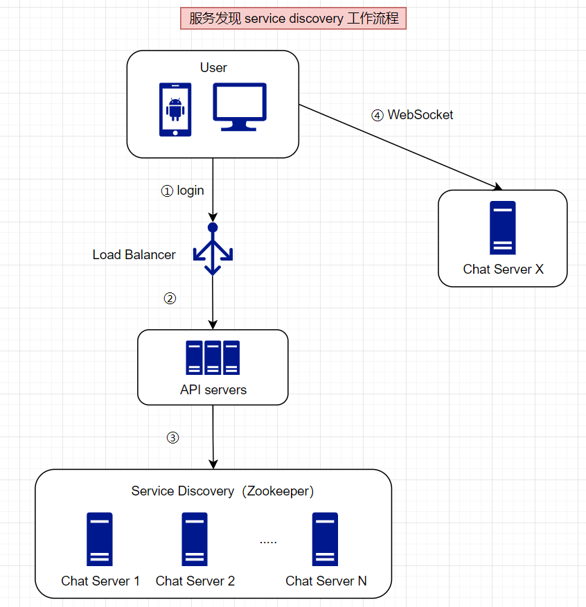 Chat Server X),返回选中的服务器信息给用户 - ④ 随后用户通过Web Socket连接到聊天服务器