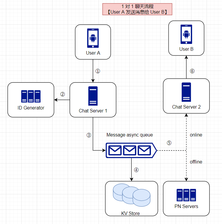 - ① 用户A向聊天服务器1发送1条聊天信息(此处会通过服务发现为UserA选择一个最佳的聊天服务器建立连接)