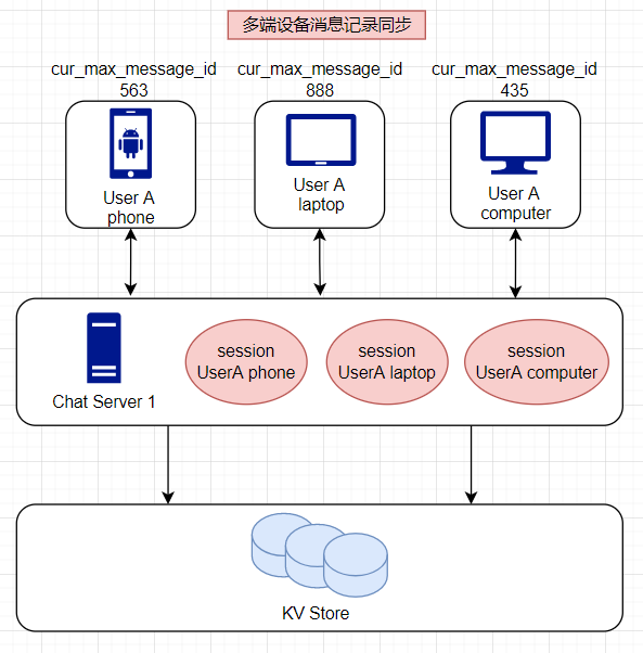 基于上述设计,由于每个设备上都维护着各自的cur_max_message_id,因此信息同步很容易(每个设备都可以从KV store中获取到当前登录用户存储的最新信息)