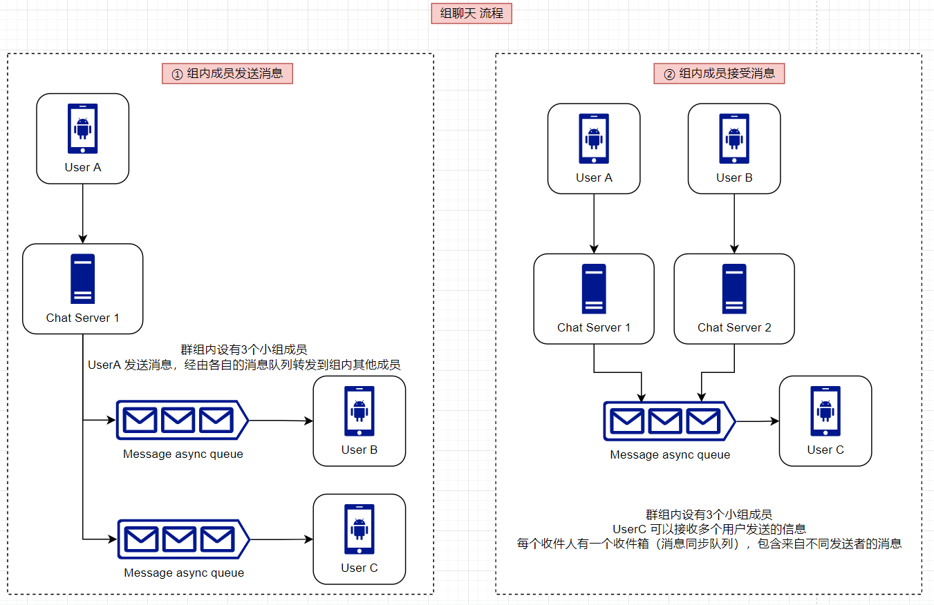 - User发送消息:用户消息被复制到每个组员的消息同步队列中,可以理解为每个成员拥有自己的收件箱(消息同步队列)