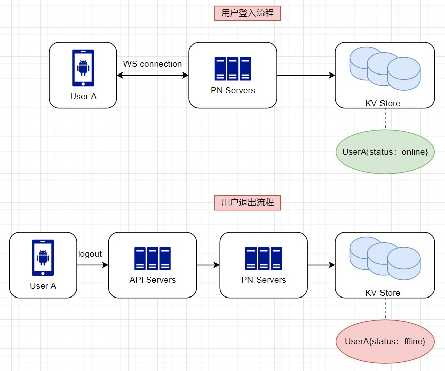 用户的登录流程体现在"服务发现"这一个过程,在客户端和实时服务之间建立WebSocket连接后,用户A的在线状态和最后活动时间戳被保存在KV存储中。状态指示器显示用户在登录后处于在线状态