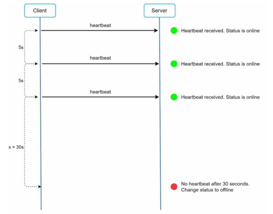 结合图示分析,客户端每5秒向服务器发送一个心跳事件。在发送了3个心跳事件后,客户端被断开连接,并且在x=30秒内没有重新连接(这个数字是任意选择的,以演示逻辑),在线状态被改变为离线。