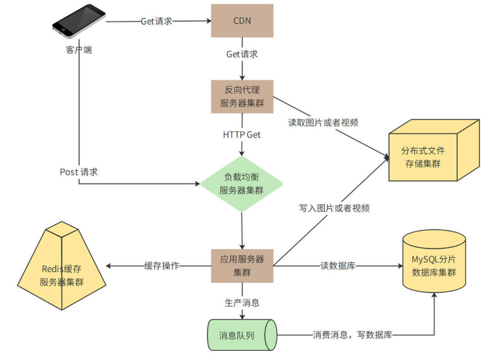 此处划分为“Get请求”和“Post请求”两条链路,Get请求主要处理刷微博的操作,Post请求主要处理发微博的请求,这两种请求处理也有重合的部分(结合下述拆分图示分析)