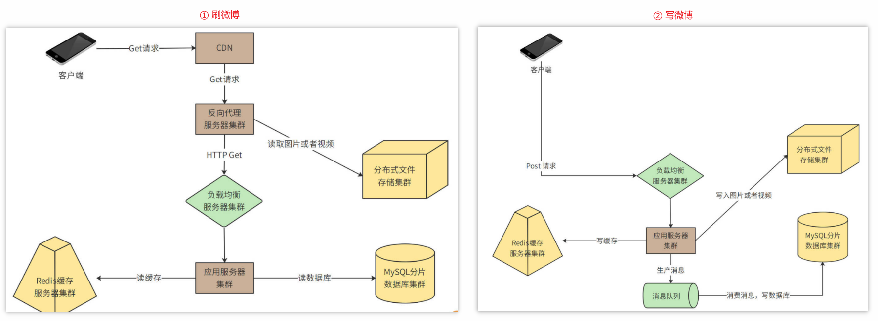 - ① 需求分析:关注微博系统的核心功能(发微博、关注好友、刷微博)