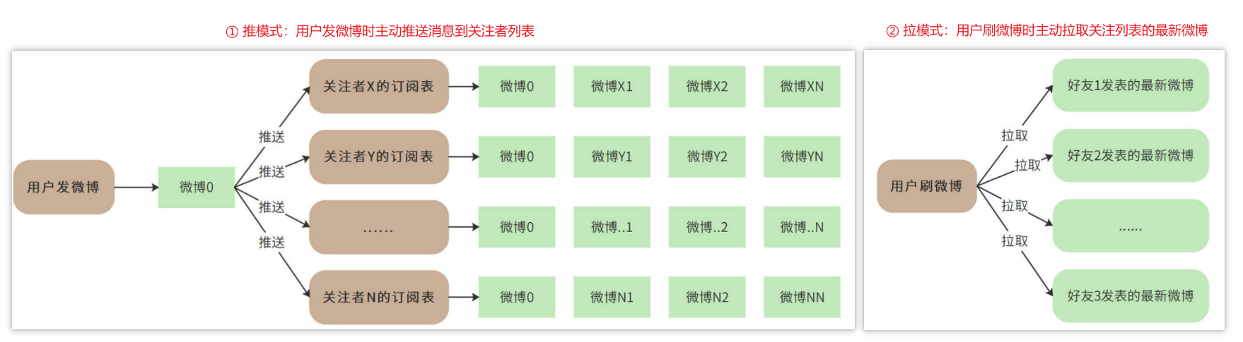 - 拉模式:用户刷微博的时候主动拉取关注列表中最新发表的微博信息,虽然解决上述推模式的写压力,但如果关注列表过多或者关注好友发送太多微博就会存在读压力,需通过限制关注列表上限或引入缓存机制来缓解读压力