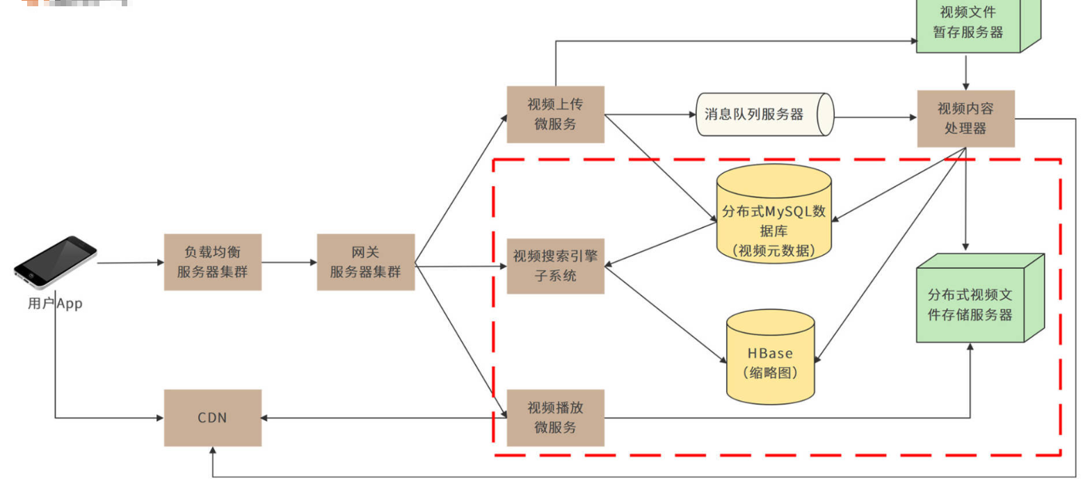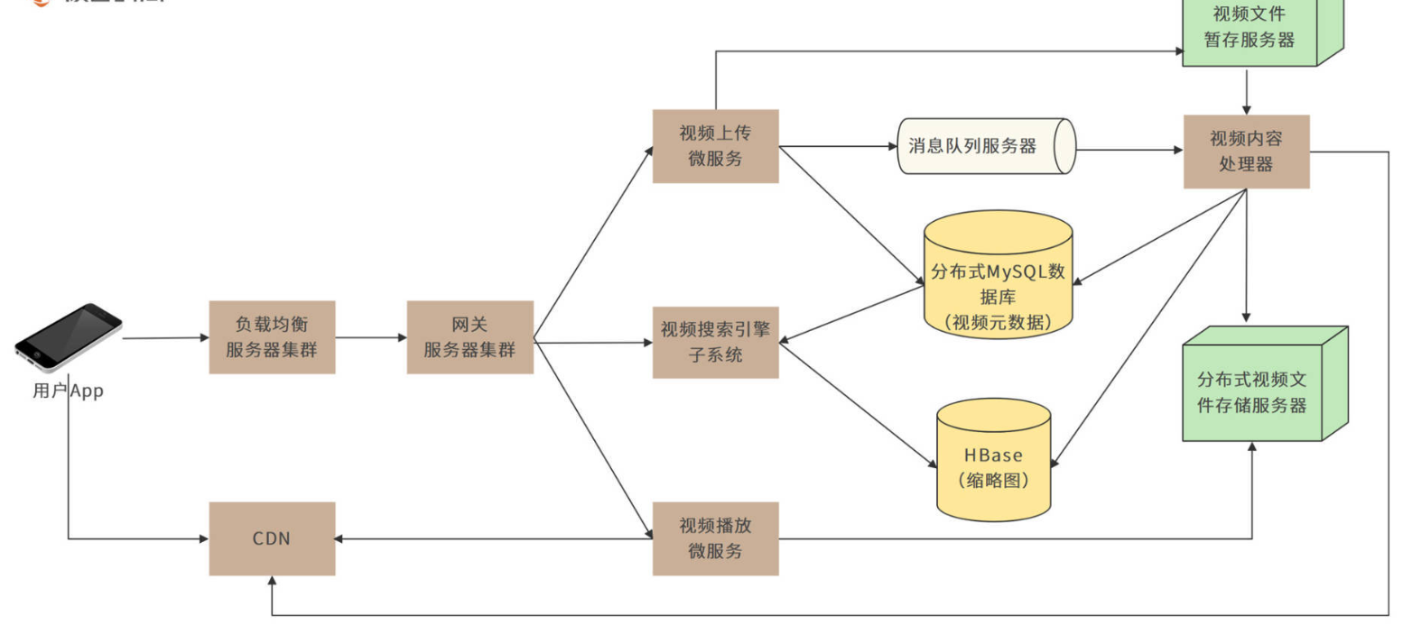 - ① 服务设计(分层设计):基于核心功能,划分服务为视频上传微服务、视频搜索引擎子系统、视频播放微服务,引入负载均衡、CDN、MQ、海量数据存储构建短视频系统核心架构