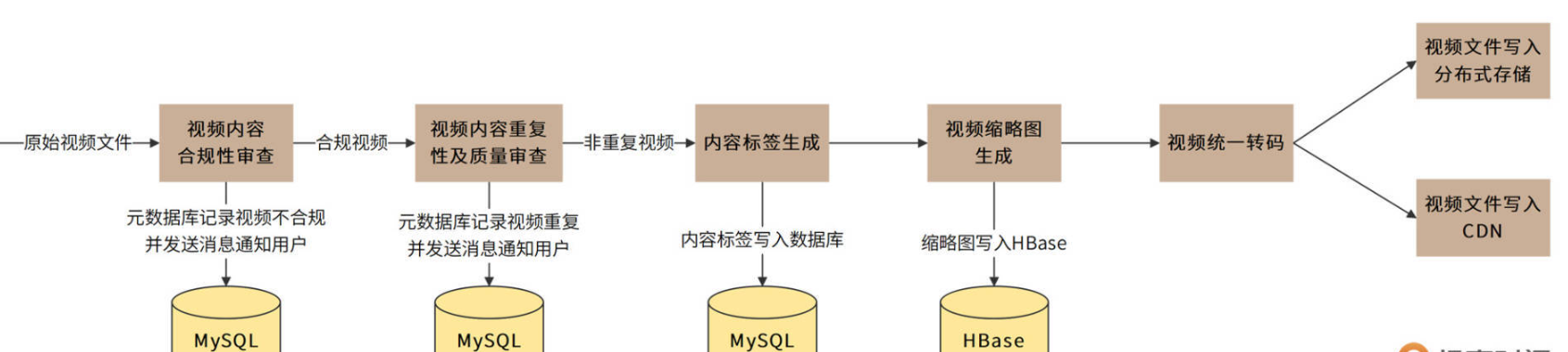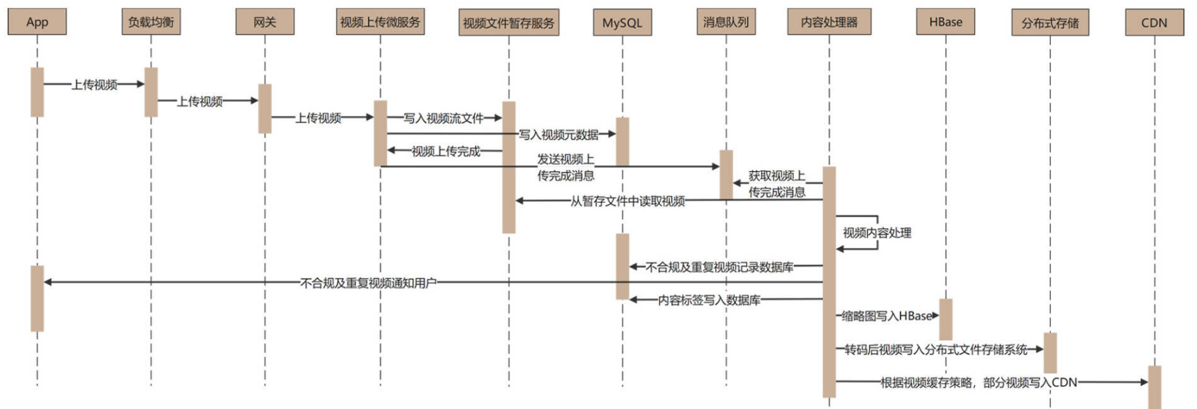 合规且非重复的视频会经过统一转码,最终被写入分布式文件存储和CDN。这样视频上传处理就完成了,具体时序图如下