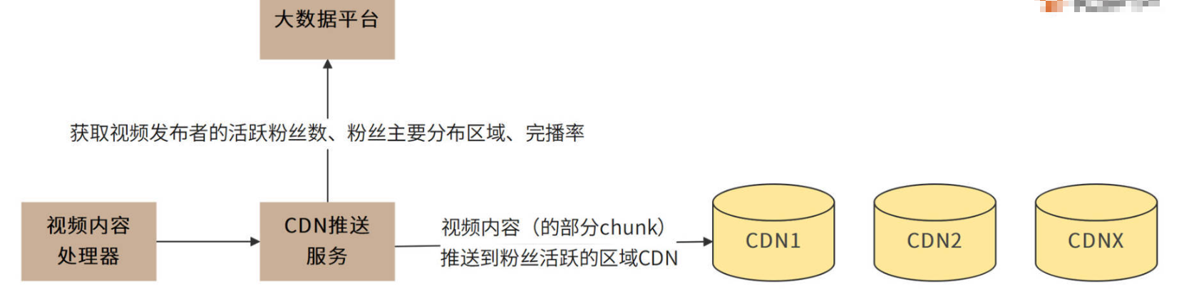 从图中可以看出,视频内容处理器进行完视频处理后,一方面会将视频存储到视频存储系统中,另一方面又会调用CDN推送服务。然后,CDN推送服务将调用大数据平台,获取视频上传者的活跃粉丝数、粉丝分布区域等数据。如果是10万粉丝以上的用户发布了短视频,CDN推送服务会根据其粉丝活跃的区域,将视频推送到对应区域的CDN服务器上。