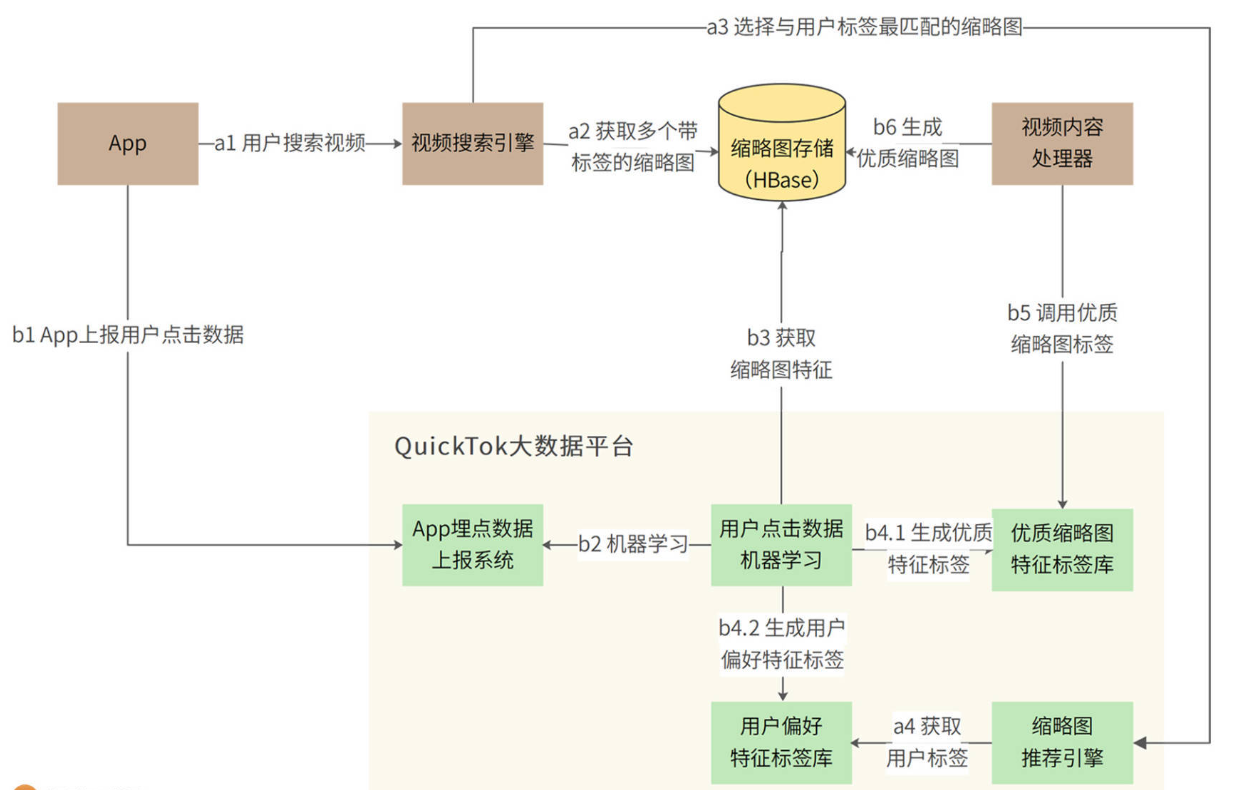 a过程中,用户通过搜索引擎搜索视频,搜索引擎产生搜索结果视频列表后,根据视频ID从缩略图存储中获取对应的缩略图。但是,一个视频可能对应很多个缩略图,如果想要显示最吸引当前用户的那个,搜索引擎就需要调用大数据平台的缩略图推荐引擎进行推荐。