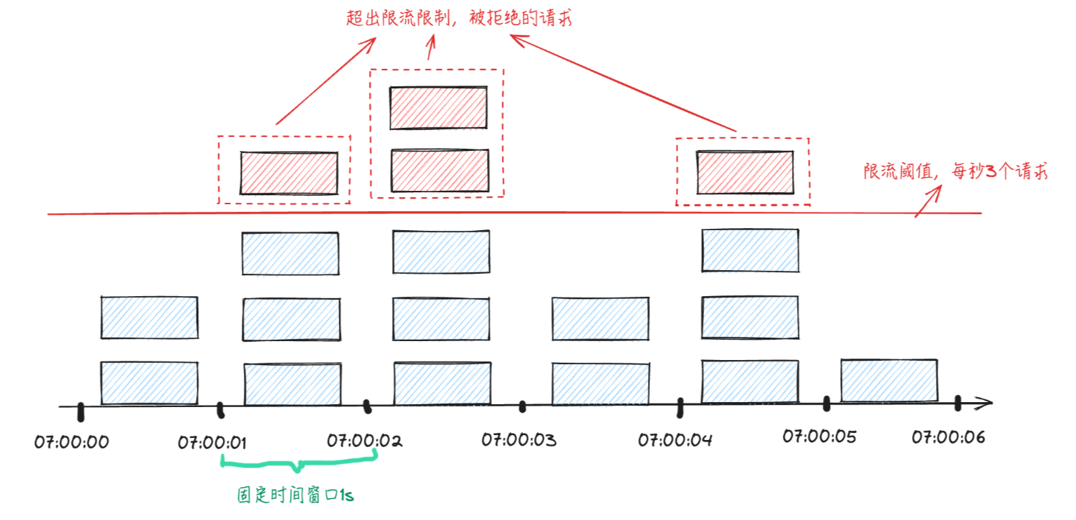 如下所示,假设时间窗口长度为1s,限定限流阈值为3,每秒内超过3个以上的请求则直接拒绝