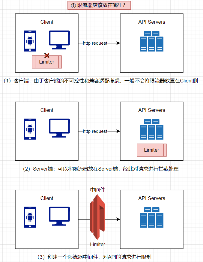 - ❌客户端:一般来说,客户端是执行速率限制的不可靠场所,因为客户端请求很容易被恶意用户伪造,且无法控制客户端的实现,所以一般不会将限流器放置在客户端