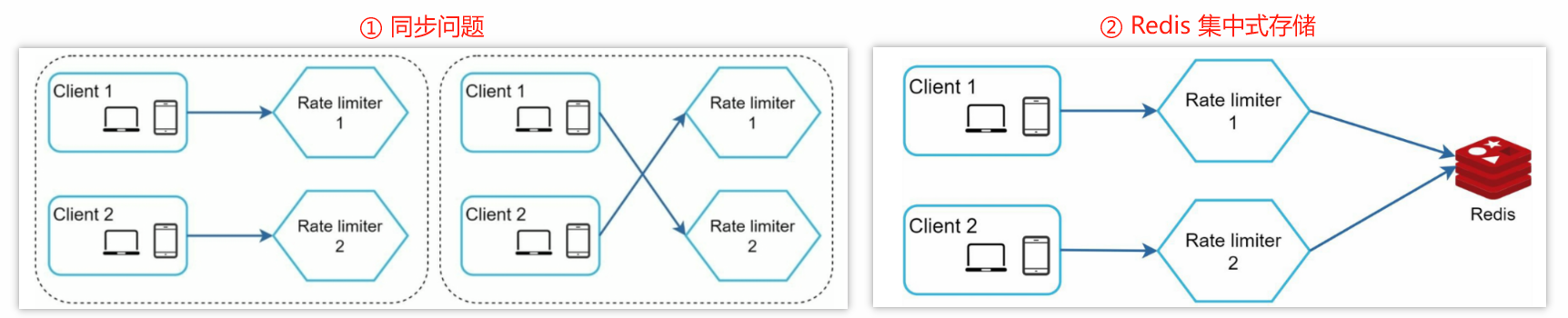 结合下图①分析,客户端 1 将请求发送到限流器 1,客户端 2 将请求发送到限流器 2。 由于 Web 层是无状态的,客户端可以将请求发送到不同的限流器,如图①右侧 如果没有发生同步,限流器 1 不包含有关客户端 2 的任何数据,则限流器无法正常工作。